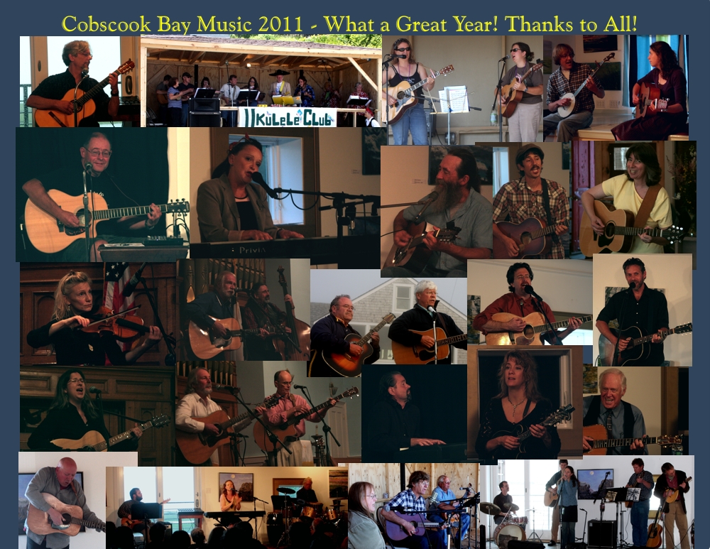 From top left - Michael DeLalla, "All Day Music" at the boat landing, the Pink Capos, Chris and Ally, the late Warren Foley, Maryann Price, and Jon Watt, Adam Nordell, Deb Cowan, Susan Ramsey, David Mallett, and Michael Burd, Schooner Fare (Chuck & Steve Romanoff), Andrew McKnight, Rod Picott, Kara McCrimmon, John Viselli, Jim O'Neil (O'McCrelli), Radoslav Lorkovic, Karen Mal, and Ronny Cox, Steve Erwin, Daphne Nichols. Away Downeast, and Slim Chance & the Can't Hardly Play Boys.